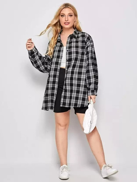 Women Oversized Fit Checkered Spread Collar Casual Shir...