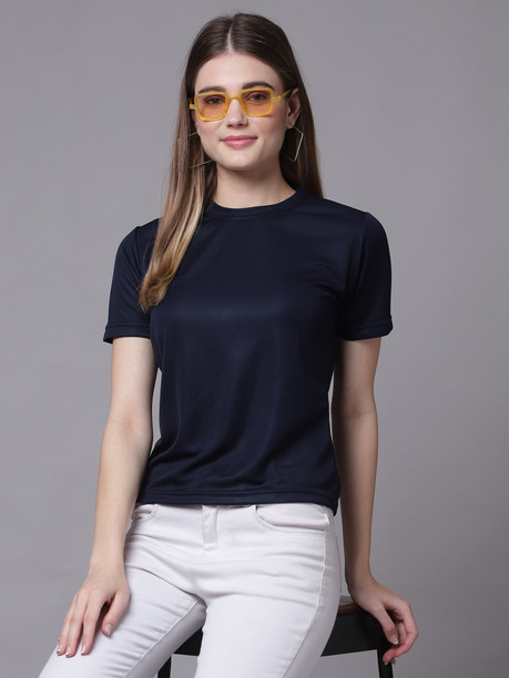 Women Solid Round Neck Polyester Navy Blue T-Shirt