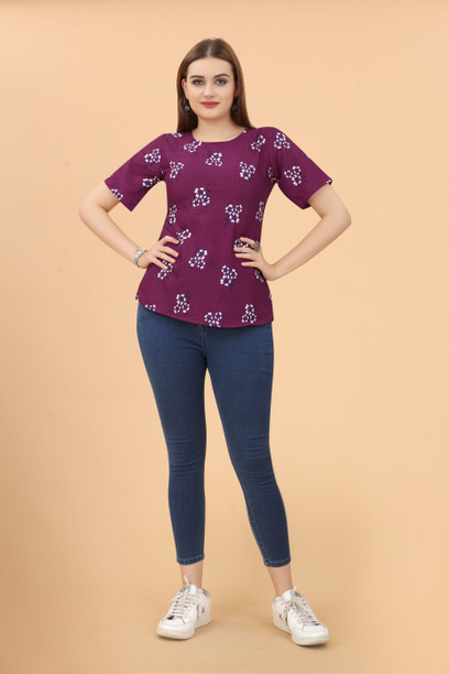 Pack of 2 Women Printed Round Neck Polycotton White T-S...