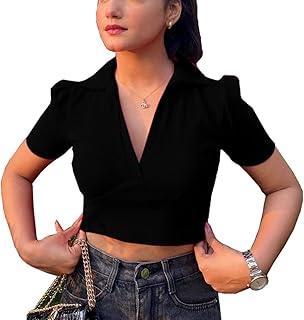Solid V-Neck Collar, Short Sleeve, Slim Fit Ribbed Women's & Girls Crop Top